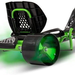 20-inch drift tricycle, with smooth lines and comfortable design, adjustable seat, sturdy steel frame, easy to operate, suitable for children over 8 years old, equipped with LED lighting and foot brakes, available in green and black colors.